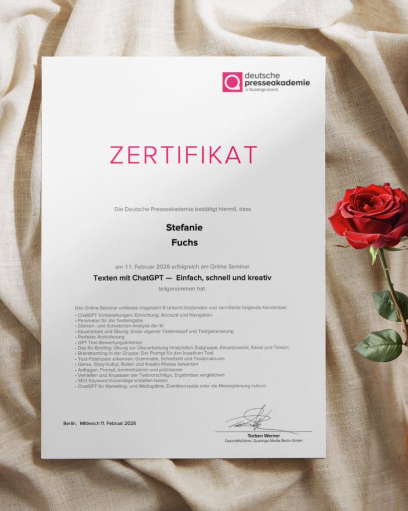 Als PR-Agentur ist es unser Anspruch, Trends nicht nur zu beobachten, sondern sie kompetent und verantwortungsvoll in unsere Arbeit zu integrieren. Deshalb hat Stefanie Fuchs von FUCHS PR & CONSULTING an einer Weiterbildung zum Thema „Texten mit ChatGPT“ erfolgreich teilgenommen. Das Online-Seminar umfasste insgesamt 6 Unterrichtsstunden und vermittelte folgende Kenntnisse: